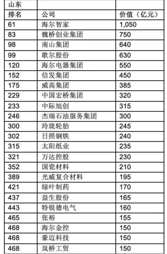 从榜单中获悉,海尔智家以1050亿元位居省内第一,魏桥创业集团以750亿元排名第二,南山集团640亿元位居第三,歌尔股份630亿元位居第四,这也是山东仅有的4个位于总榜单前100名的企业,分别位列总榜单第61位、第83位、第98位和第99位。