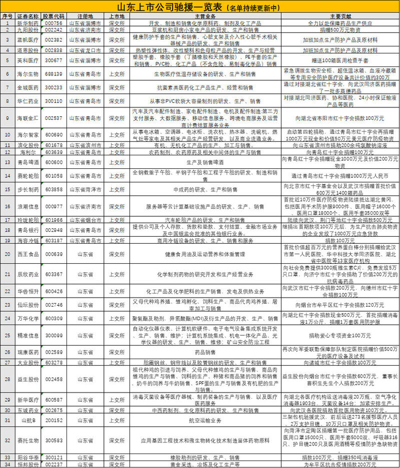 今日,中国上市公司协会发布了涵盖500家上市公司的最新上市公司战“疫”一览表。鲁网·泰山财经记者梳理后发现,有34家来自化工、医药、高新科技等行业的山东上市公司位列这份名单之中。面对疫情,山东上市公司诠释着作为企业的初心使命、以及对社会的责任担当!