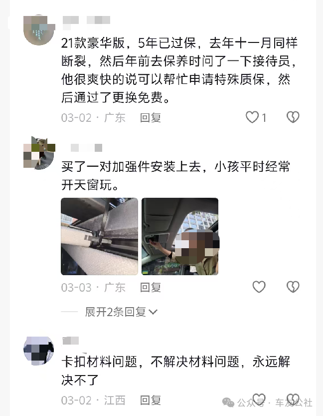 “我查了很多车友反馈,发现大家都是刚过保就出这问题,不是我一个人的车这样。” 叶先生告诉记者,车主们普遍认为该卡扣断裂的原因是 “原厂塑料材质不耐高温、设计存在老化缺陷”—— 南方夏季车内高温暴晒后,塑料卡扣易变脆断裂,北方冬季低温也可能加速老化,“这不是人为使用不当,而是产品本身的问题”。