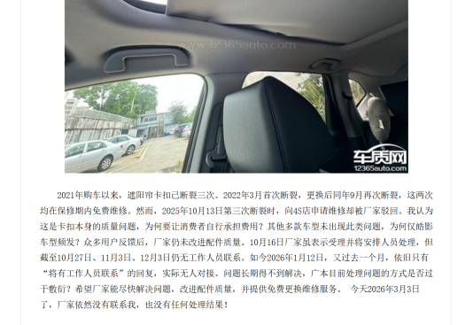 记者在车质网发现,不少车主的投诉 “石沉大海”。一位2021年购车的车主表示,遮阳帘卡扣已断裂三次:2022年两次在保内免费更换,但2025年10月第三次断裂后,厂家驳回免费维修申请,“从2025年10月投诉到2026年3月,厂家只说‘安排人员处理’,却没人联系我,问题拖了半年没解决”。