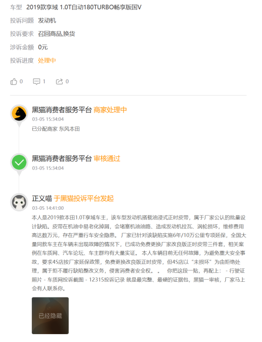 黑猫投诉平台上,大量车主反馈类似遭遇:河南一位车主2019年购入的享域1.0T车型,因正时皮带浸泡在机油里掉毛,多次导致机油滤网堵塞、涡轮增压器损坏,“车总里程才两万多公里,2024年12月刚换完正时皮带与涡轮,2026年2月就在高速上突发故障,差点出事”。