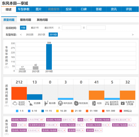 彭先生的经历只是冰山一角。车质网数据显示,2019款享域的306件质量投诉中,正时皮带掉毛堵塞涡轮问题达107件,占比超三分之一,成为该车型最核心的投诉痛点。