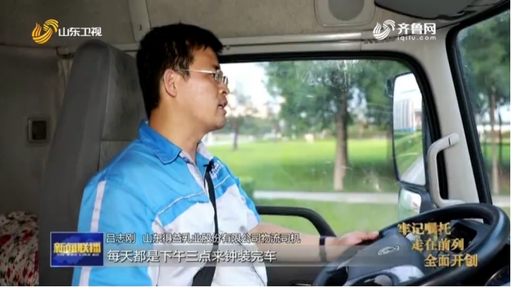 在得益乳业,8辆大型冷链物流车正在发货平台前装车。这些乳品当天就要送到其他城市,吕师傅负责的是济南干线,每天配送五万份奶。