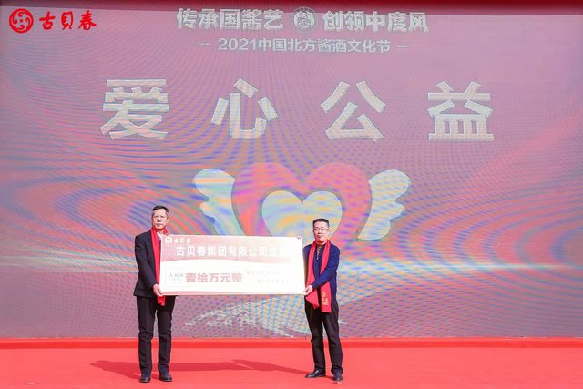 古贝春集团有限公司多年来热心公益事业,始终将回报社会作为公司的一项重大责任。活动现场,由周晓峰董事长在2011年亲自封坛的一坛陈年稀酿,被聊城某企业以10万元高价认购。而古贝春集团有限公司将此款项现场捐赠给了武城县幸福中心,作为敬老助老公益慈善资金。古贝春集团有限公司常务副总经理孙步东、武城县妇幼保健院院长、武城县幸福中心戴树超分别代表双方举行了捐赠、受捐仪式。