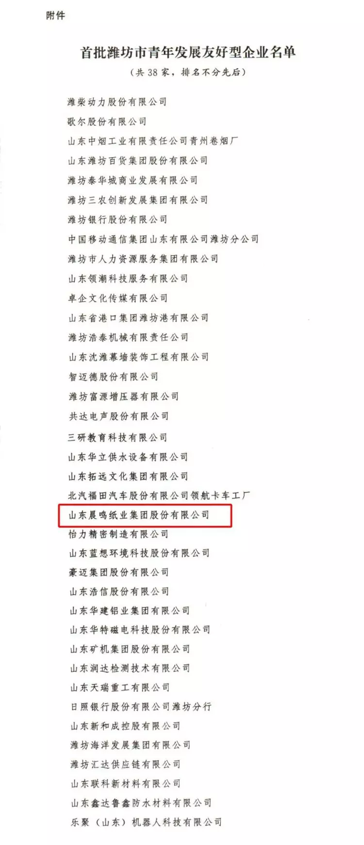 鲁网7月18日讯 近日,由共青团潍坊市委、潍坊市国有资产监督管理委员会、潍坊市市场监督管理局、潍坊日报社联合开展的首批青年发展友好型企业选树活动公布评选结果,晨鸣集团被认定为首批潍坊市青年发展友好型企业。