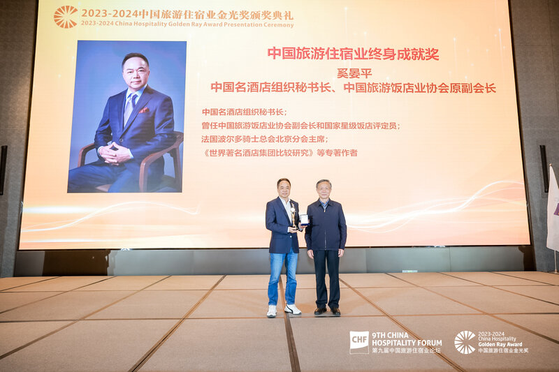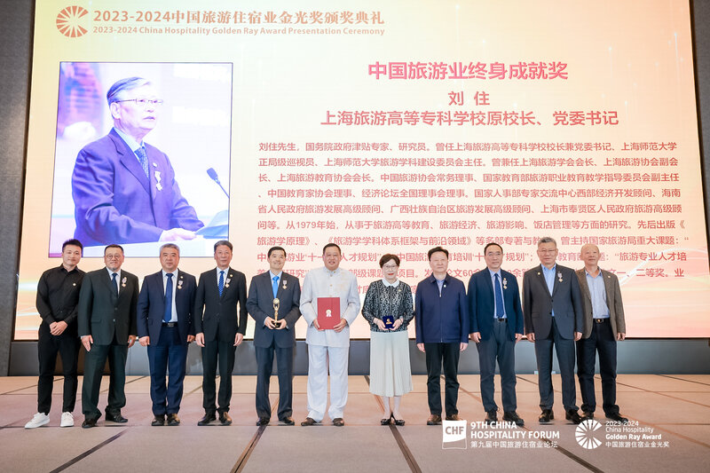 2023-2024中国旅游住宿业金光奖颁奖典礼也于2024年4月26日晚在君廷宴会厅隆重举行,第十一届山东省政协副主席、党组副书记雷建国、山东省委原副秘书长、山东省精品旅游促进会会长杜文彬、中国酒店论坛组织主席张楠、中国名酒店组织秘书长奚晏平等为获奖单位及个人颁奖。上海旅游高等专科学校原校长、党委书记刘住先生荣膺金光奖“中国旅游业终身成就奖”,中国名酒店组织秘书长奚晏平先生荣膺金光奖“中国旅游住宿业终身成就奖”。全场莅会嘉宾和代表全体起立,给获奖人物送去发自内心的掌声和祝福。