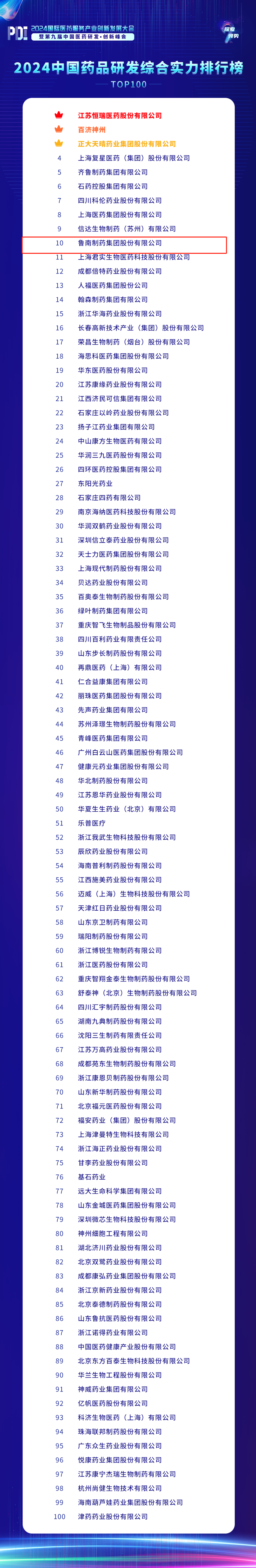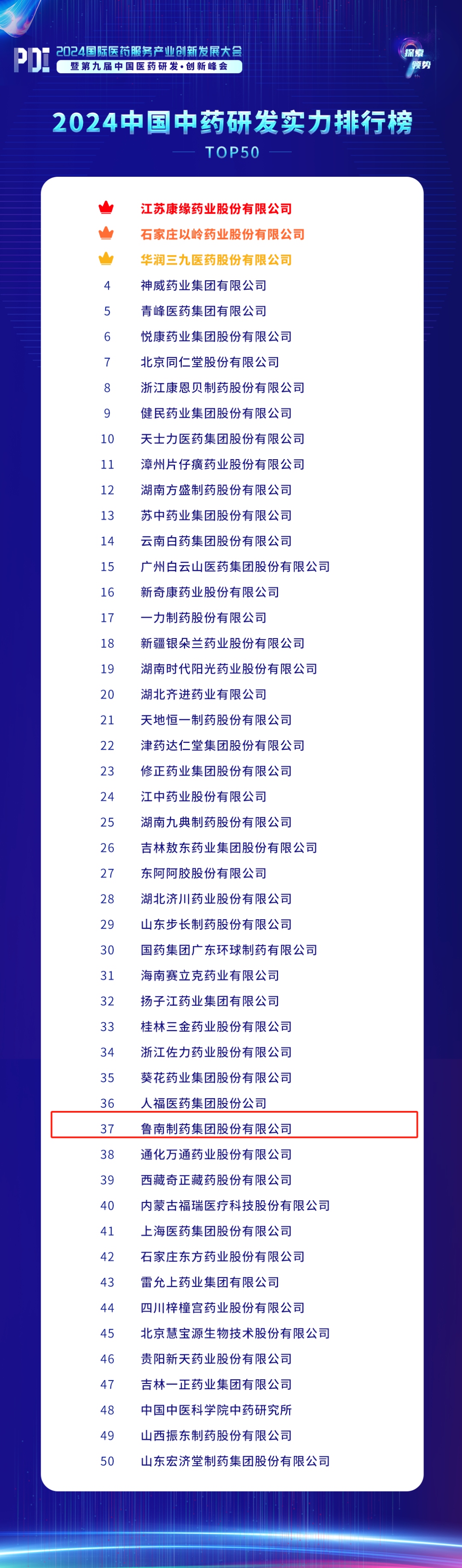 7月4日,“2024国际医药服务产业创新发展大会暨第九届中国医药研发·创新峰会(PDI)”在雄安举行,会上隆重发布《2024中国药品研发实力排行榜》系列榜单并颁发《2024中国医药创新领军人物奖》,鲁南制药集团榜上有名,分别位列“2024中国药品研发综合实力排行榜”第10位、“2024中国化药研发实力排行榜”第15位、“2024中国中药研发实力排行榜”第37位,“2023中国生物药研发实力排行榜”第31位;鲁南制药集团股份有限公司经方与现代中药融合创新全国重点实验室副主任关永霞荣获2024中国医药创新领军人物奖。