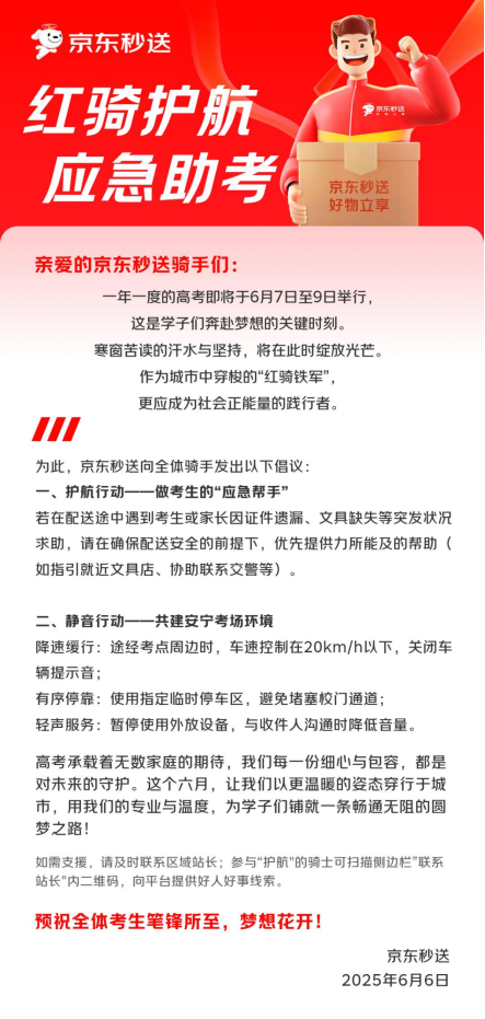 京东外卖还号召骑手在途经考点周边时,降速缓行、避免鸣笛、有序停靠、轻声服务,为考生“静音护航”。