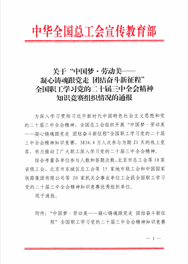 扎实开展“第一议题”、“三会一课”、专题党课、主题党日等活动,实现规定动作扎实、自选动作出彩,推动每一名党员成为一面旗帜,打造最强战斗堡垒;组织职工深入学习党的创新理论,获得全国职工学习党的二十届三中全会精神知识竞赛优秀组织单位,被全国总工会通报表扬;