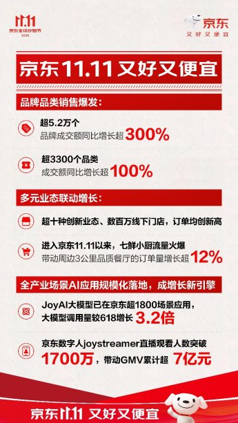 这个京东 11.11,AI 技术全面渗透经营各环节,助力品牌和商家降本提效。京东云携 JoyAI 系列产品服务超 300 万商家;JoyAI大模型已在京东超1800场景应用,大模型调用量(token)较618增长了3.2倍;JoyBuilder模型开发平台,调用量较去年同期增长超6倍;京东数字人JoyStreamer服务品牌超35000家,截至目前,数字人直播观看人数突破1700万,带动GMV 累计超 7 亿元。AI 重构消费体验,兼顾 “高效率 + 高情商”的京东智能客服累计咨询服务量超13亿,覆盖了售前、售中、售后、物流等全场景,用户满意度80%以上。京东金融以白条分期免息、支付补贴、供应链金融商家息费优惠、保险服务等多种形式“百亿消费补贴”助力销售增长。