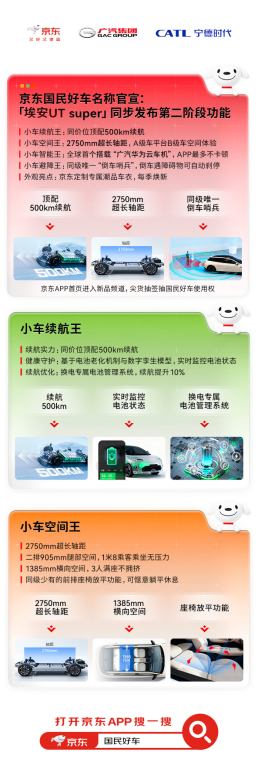 10月23日,京东“国民好车”又有新动作。记者在京东APP商品详情页发现,京东“国民好车”页面信息已更新,公布了新车正式名称——“埃安UT super”,并披露了该车型在续航、设计、空间与安全四个维度的核心配置。