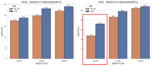 在这次实验中,出现了一个令人震撼的“补弱效应”。研究团队采用三分位法将学生划分为低分、中分和高分组。数据监测显示,AI对“中低基础”学生的提振效果堪称颠覆。在七年级低分组的对比中,AI的介入产生了一种质变:真人组的后测平均分停留在47.90分,而AI组则将这部分学生的成绩强势拉升至72.46分。