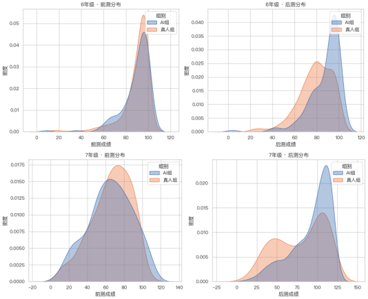 艾瑞咨询的报告指出,在前测阶段,两组学生的成绩分布曲线几乎完全重叠,起跑线高度一致。然而在终点线,两条曲线走向了截然不同的命运: