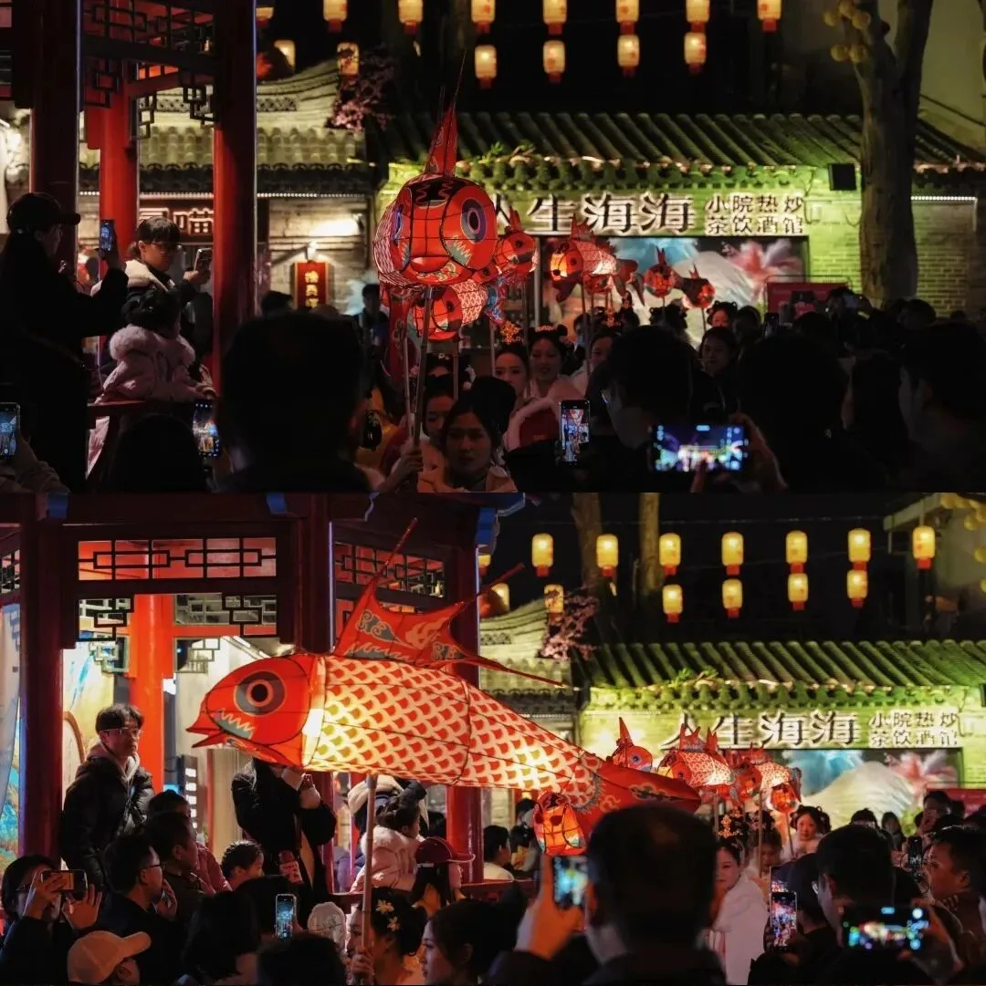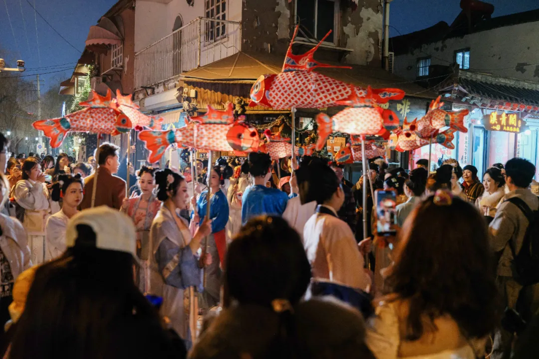 这个春节策划的“礼韵戏集·趣游明府城”系列活动,把明府城变成沉浸式国风现场。从白天的古风快闪,到夜晚的鱼灯巡游,NPC穿梭在街巷之间,随时展开互动。