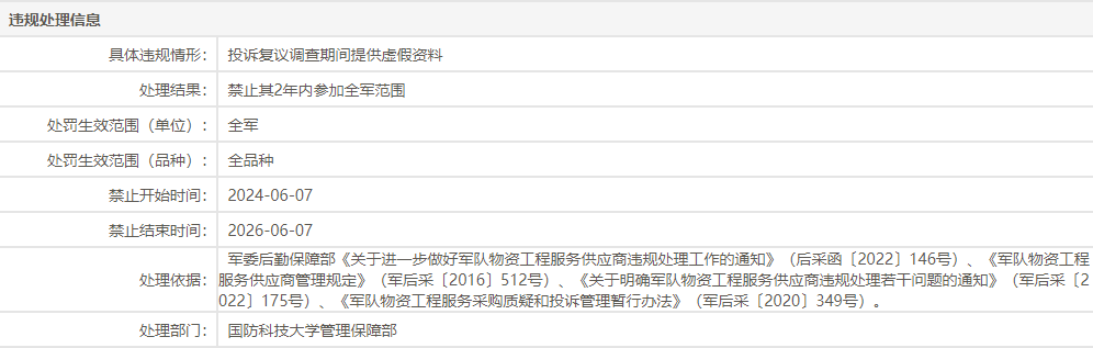 央广财经记者发现,宝德网安在申报稿之外存在违规情况。军队采购网信息显示,宝德网安因在投诉复议调查期间提供虚假资料,被国防科技大学管理保障部禁止2年内参加全军范围的采购活动,禁止结束时间为2026年6月7日。