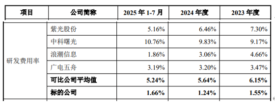 申报稿中,慧博云通将紫光股份、中科曙光、浪潮信息和广电五舟列为宝德计算的可比公司。报告期内,上述可比公司研发费用率的均值分别为6.15%、5.64%、5.24%,而宝德计算的研发费用率仅为1.55%、1.24%、1.66%,且在报告期各期,四家可比公司的研发费用率均高于宝德计算。