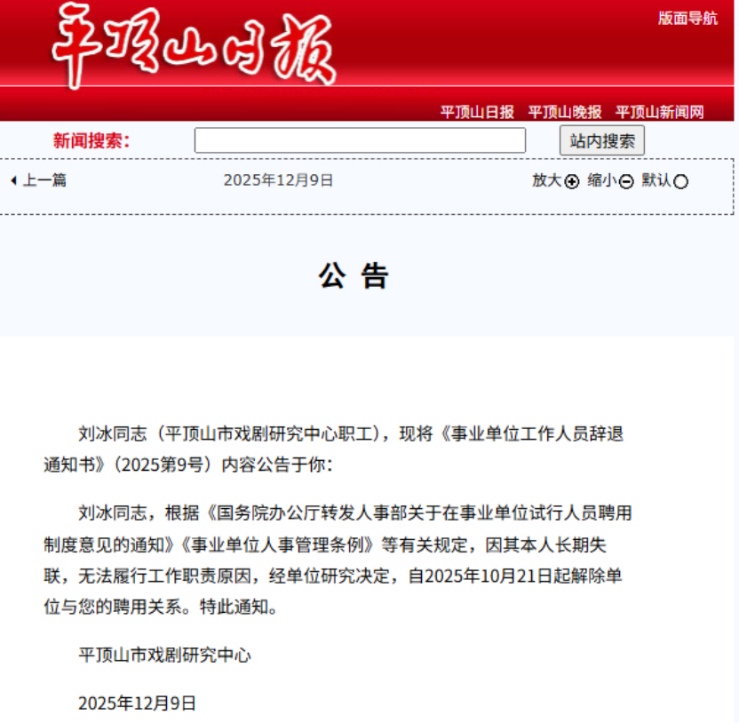 公告显示,被辞退对象为中心职工刘冰,该同志因长期失联,无法履行工作职责,被平顶山市戏剧研究中心依据《国务院办公厅转发人事部关于在事业单位试行人员聘用制度意见的通知》《事业单位人事管理条例》等有关规定解聘。