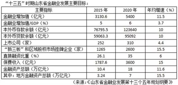 山东省金融业“十三五”纲要指导思想提出,到2020年末,全省实现金融业增加值5400亿元左右,占GDP的比重达到6%左右。其中,大力发展全牌照金融机构、支持申请交叉持牌、支持批量申报组建社区支行和小微支行等诸多发展目标成为亮点。