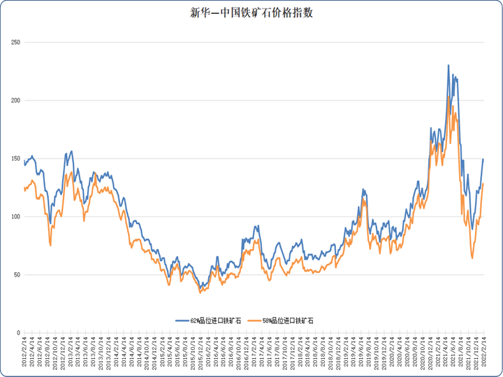 中国铁矿石价格指数显示,2月8日至2月14日间,进口铁矿石价格小幅下跌。数据显示,2月14日,我国62%品位进口铁矿石价格指数为147,较2月7日下跌1.34%;58%品位进口铁矿石价格指数为127,较2月7日下跌0.78%。
