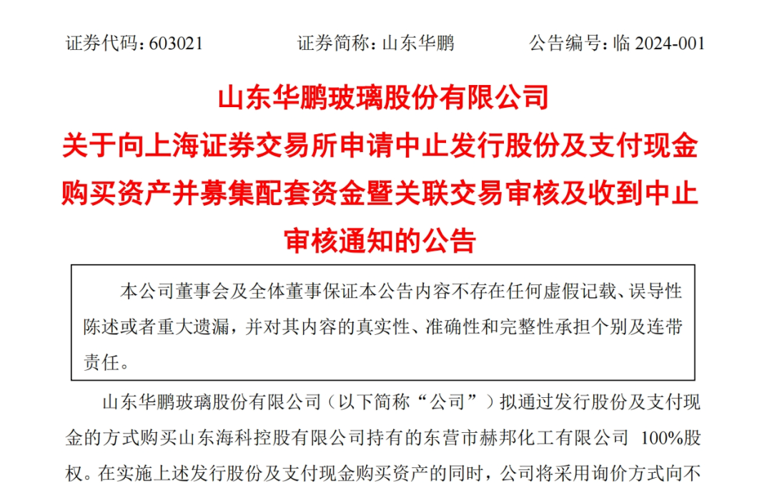 1月1日晚间,山东华鹏(603021.SH)公告,公司于2023年12月29日收到上海证券交易所审核通知:公司主板重组上市业务已中止审核。