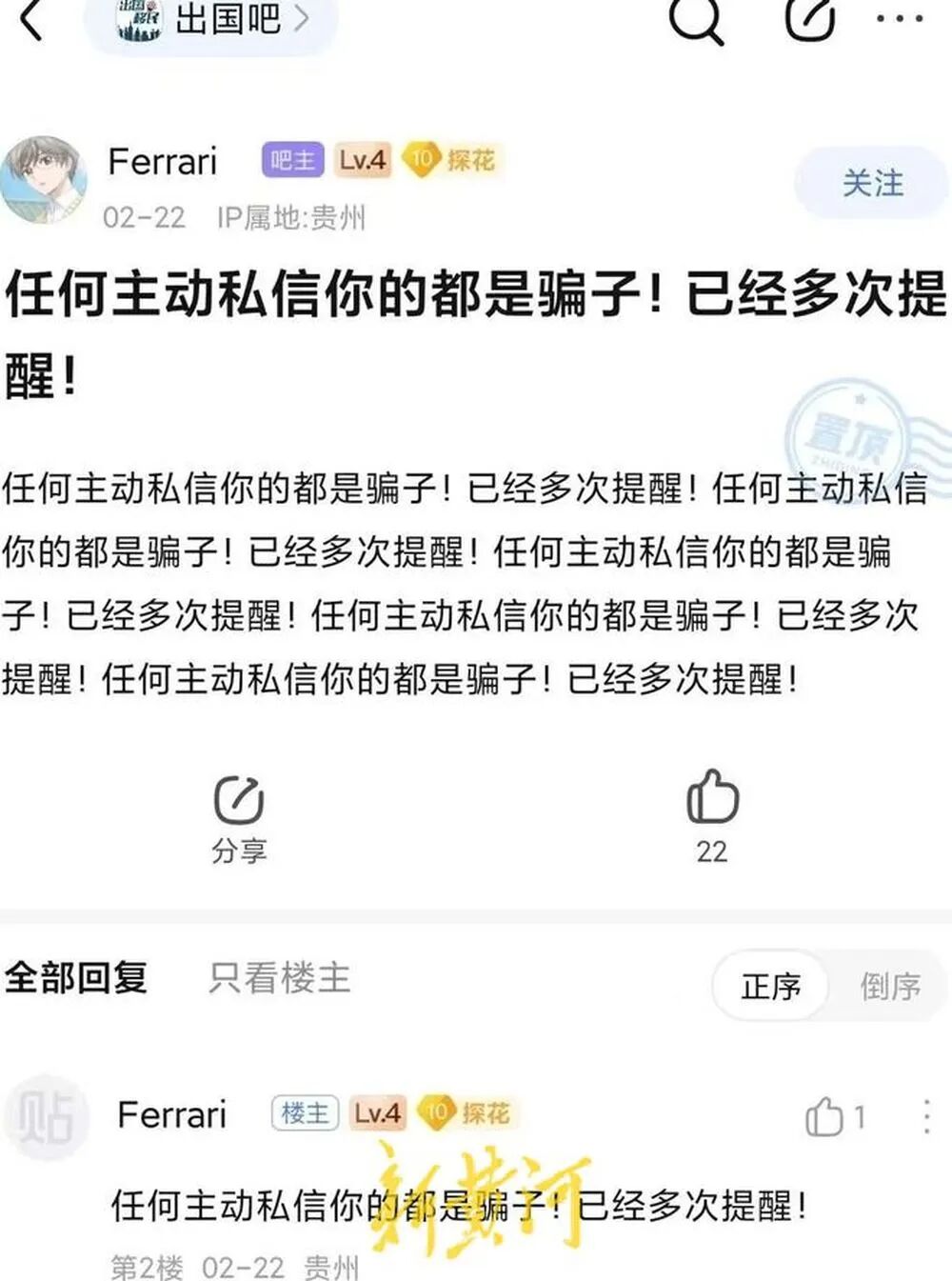 记者发现,尽管“出国吧”关于东南亚电信诈骗的讨论很多,但百度贴吧并未对有违规内容的帖子进行清理,也未限制发布,只有吧主在置顶帖子中提到“任何主动私信你的都是骗子!已经多次提醒!”