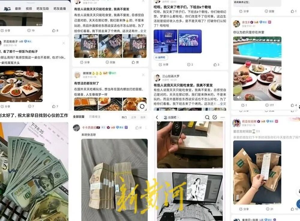 在“出国吧”贴吧中,网帖达847万条,62.4万人关注,热门和最新网帖主要是围绕东南亚电信诈骗的讨论,用“猪仔”来代指被诱骗到东南亚地区从事诈骗活动的人员。有网友晒出“猪仔”被暴力惩罚的画面,提醒大家千万不要听信东南亚高薪招聘的骗人话术。然而,也有发帖人明确表示,自己就职于东南亚某国的电诈公司,还会分享豪华团建照片,晒大餐、豪车、现金,或者用“钓鱼”方式引诱别人前来询问。