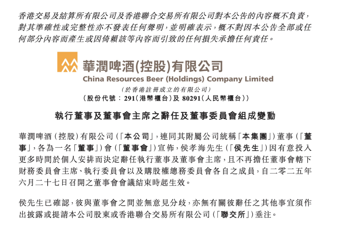 6月27日,华润啤酒(控股)有限公司发布公告,宣布董事会主席侯孝海辞职,辞职原因是其有意投入更多时间于个人安排。