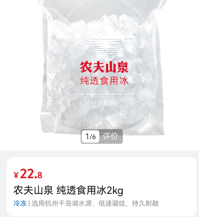 有消费者计算认为,冻2公斤冰块需4瓶500毫升的农夫山泉瓶装水,22.8元相当于每瓶水售价约5.7元。因此质疑,冰块价位偏高。也有网友表示,“制冰过程确保食品卫生标准,都是成本,明码标价,属于合理范围”。