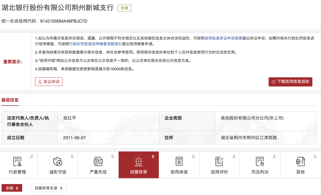 信用中国信息显示,7月3日,湖北银行股份有限公司荆州红门路支行被荆州市沙市区市场监督管理局列入经营异常名录,列入经营异常名录的原因是:“未依照《企业信用公示暂行条例》第八条规定的期限公示年度报告”。