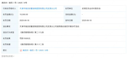 事实上,天津市瑞派安馨宠物医院有限公司武清分公司并非首次受罚。行政处罚信息显示,2021年,该企业还因人药兽用被武清区农业农村委员会罚款15000元。
