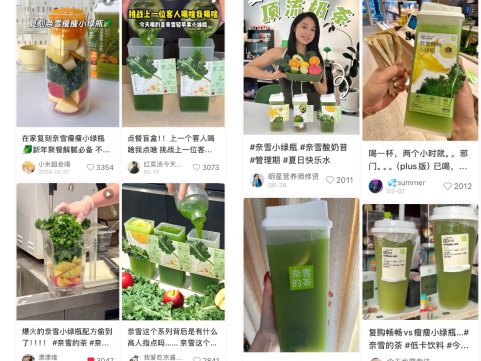 差异化优势推动其快速破圈:自推出以来,奈雪“小绿瓶”不仅持续霸榜奈雪销量、复购率TOP1,成为消费者日常健康饮品的首选,更获得百位专业营养师的联合推荐。在社交媒体上,奈雪“小绿瓶”也表现抢眼,小红书相关话题关注量突破7亿,搜索量暴增1300万,累计产出约 17 万篇相关笔记,成为“轻断食”“控卡茶饮”高频推荐饮品。 papi酱、台湾网红“馆长”等公众人物自发分享,更让其从一款茶饮升级为健康生活符号——知名博主 papi 酱在vlog中晒出“瘦瘦小绿瓶”;6 月,台湾网红 “馆长” 陈之汉直播时品尝 “奈雪小绿瓶”,相关话题迅速发酵,引发网友广泛关注。