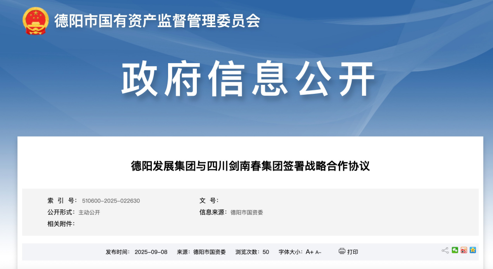 值得注意的是,在本次股权变动前不久,9月5日,德阳市属企业德阳发展控股集团有限公司党委书记、董事长李强率队赴四川剑南春集团交流座谈,双方就深化国企民企友好合作、共促产业发展达成共识,并正式签订战略合作协议。