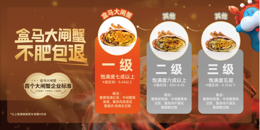 基于业内首创的“电子验蟹师”精准分级技术,盒马今年对大闸蟹产品推出“不肥包退”品质承诺。该承诺以“饱满度七成以上,K值>0.45”作为明确的准入标准。