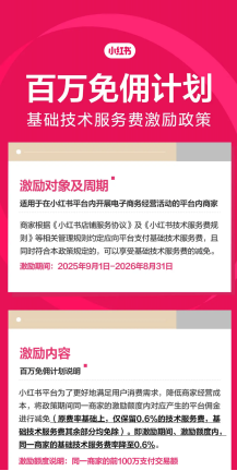 一个月前,小红书电商发布“百万免佣计划”——2025年9月1日至2026年8月31日,同一商家前100万支付交易额免除佣金,仅保留0.6%的支付渠道成本。佣金将在服务费结算时自动减免,商家无需申请。