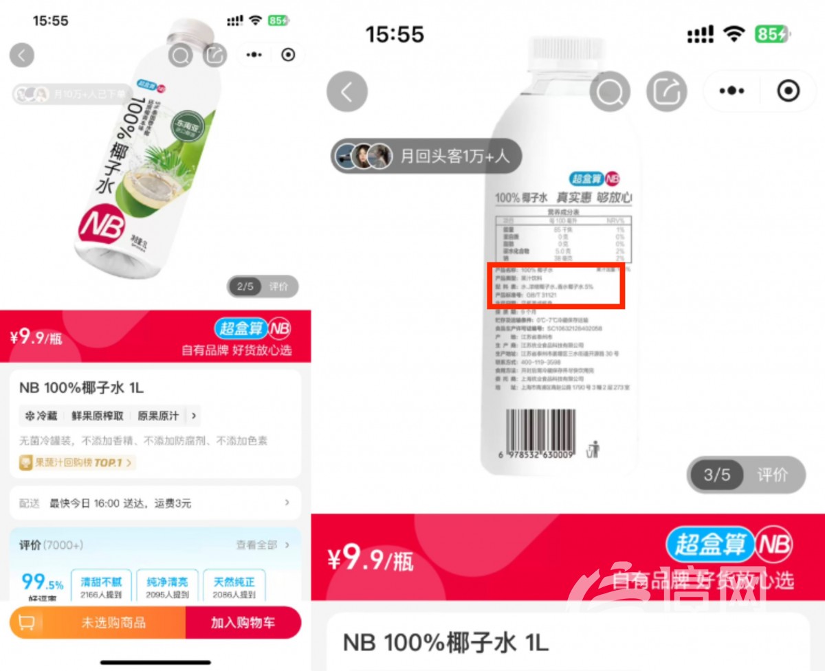 “100%椰子水”配料表首位是水 消费者直呼被超盒算NB套路了