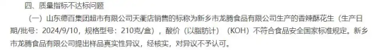 4月23日,山东省市场监管局发布关于19批次食品不合格情况的通告。通告显示,山东德百集团超市有限公司天衢店销售的标称为新乡市龙腾食品有限公司生产的香辣酥花生,酸价(以脂肪计)(KOH)不符合食品安全国家标准规定。