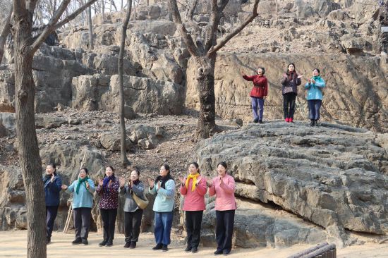 “人人那个都说哎,沂蒙山好!沂蒙那个山上哎,好风光……”2月18日,农历正月初二,沂南县马牧池乡常山庄村的山东红嫂家乡旅游区里,歌声从常山上一块黝黑的巨大山石上面传来,演唱者是红嫂家乡旅游区艺术团的三名女演员,石头下面7名女演员整齐地排成一队和声,由于演唱形式新颖,吸引了众多外地游客。这种备受游客喜欢的演唱,今年春节假期每天演出两场。