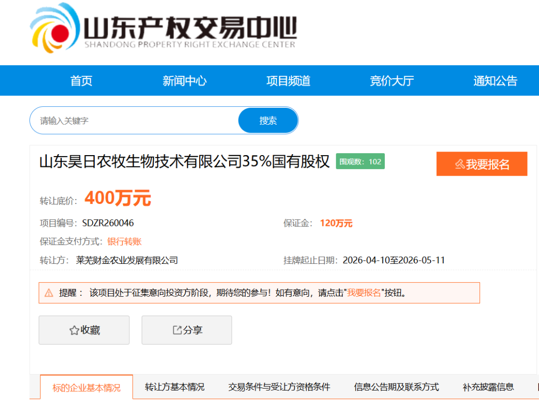 泰山财经记者获悉,近日,山东昊日农牧生物技术有限公司(简称“昊日农牧”)35%国有股权在山东产权交易中心发布股权转让信息,转让底价400万元,股权转让方为莱芜财金农业发展有限公司(简称“莱芜财金农业”)。