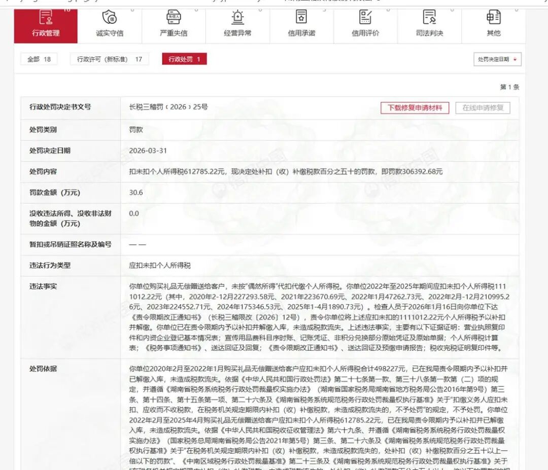 行政处罚详情显示,三湘银行的违法事实为购买礼品无偿赠送给客户,未按“偶然所得”代扣代缴个人所得税。相关处罚决定日期为2026年3月31日。