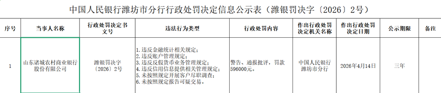 涉六大问题!山东诸城农商行被警告、通报批评并罚款59.6万元