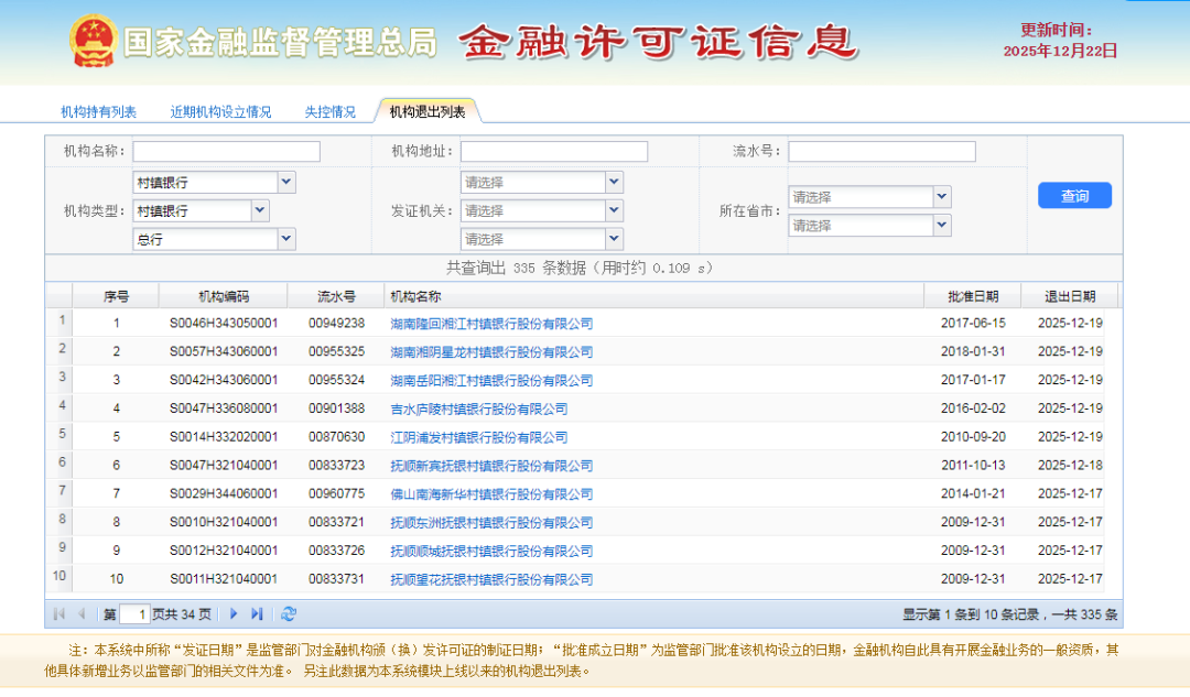 泰山财经记者获悉,2025年,全国各地中小金融机构加快整合步伐。2025年年初至12月23日期间,完成退出的村镇银行总数已达226家,退出方式多为被吸收合并或收购。记者注意到,除城商行、农商行、股份行