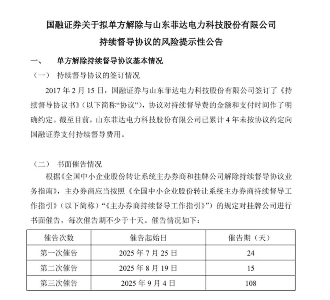 菲达科技累计四年未支付督导费用,国融证券拟单方解除持续督导协议