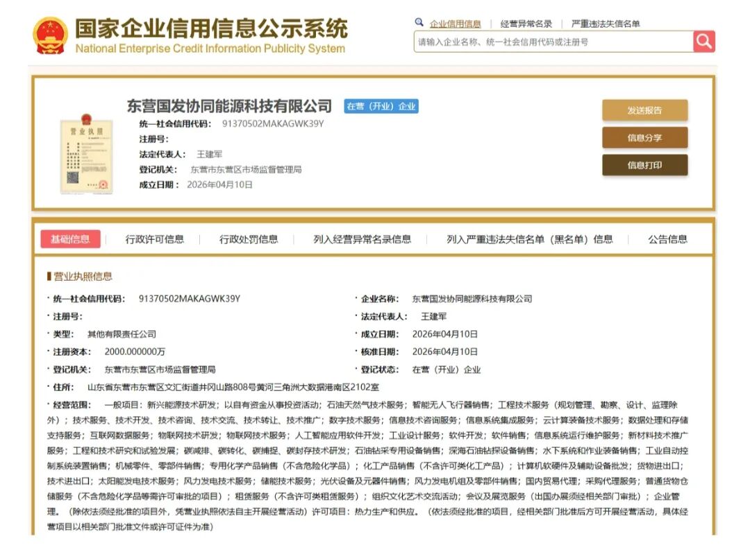 东营两级国资联合设立能源科技公司,注册资本2000万元