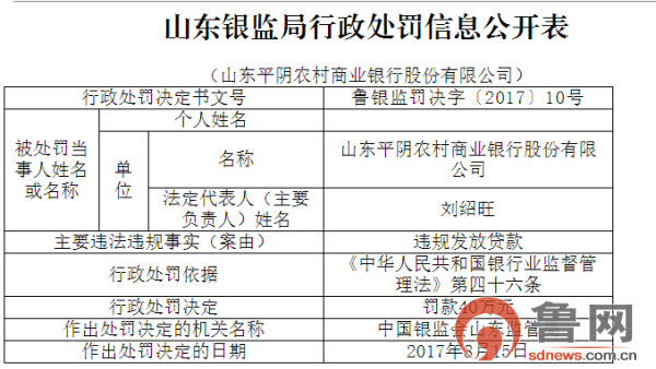 鲁网8月24日讯 (见习记者 庞亚茹 记者 王国栋)记者今日从中国银行业监督管理委员会官方网站获悉,山东平阴农村商业银行股份有限公司因违规发放贷款,山东银监局依据《中华人民共和国银行业监督管理法》第四十六条对其作出罚款40万元的行政处罚。