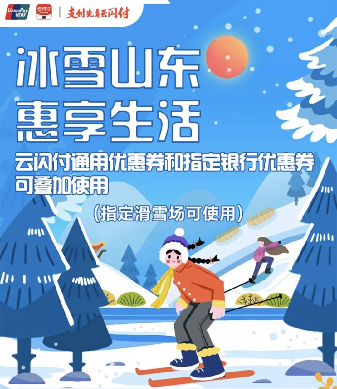 为促进冬季冰雪消费,山东银联积极引导消费跨领域融合,创新推出的“冰火两重天”促消费活动。消费者在蟠龙山滑雪场、金象山滑雪场、济南忠义冰雪体育俱乐部等近10家大型冰雪运动商户云闪付支付,可享受8折最高40元优惠。同时,赠送美团云闪付小程序支付8折最高10元火锅优惠券。让消费者玩得嗨,吃得爽!活动入口位于云闪付APP“鲁惠券”——“政府促消费”——“冰雪山东”板块。
