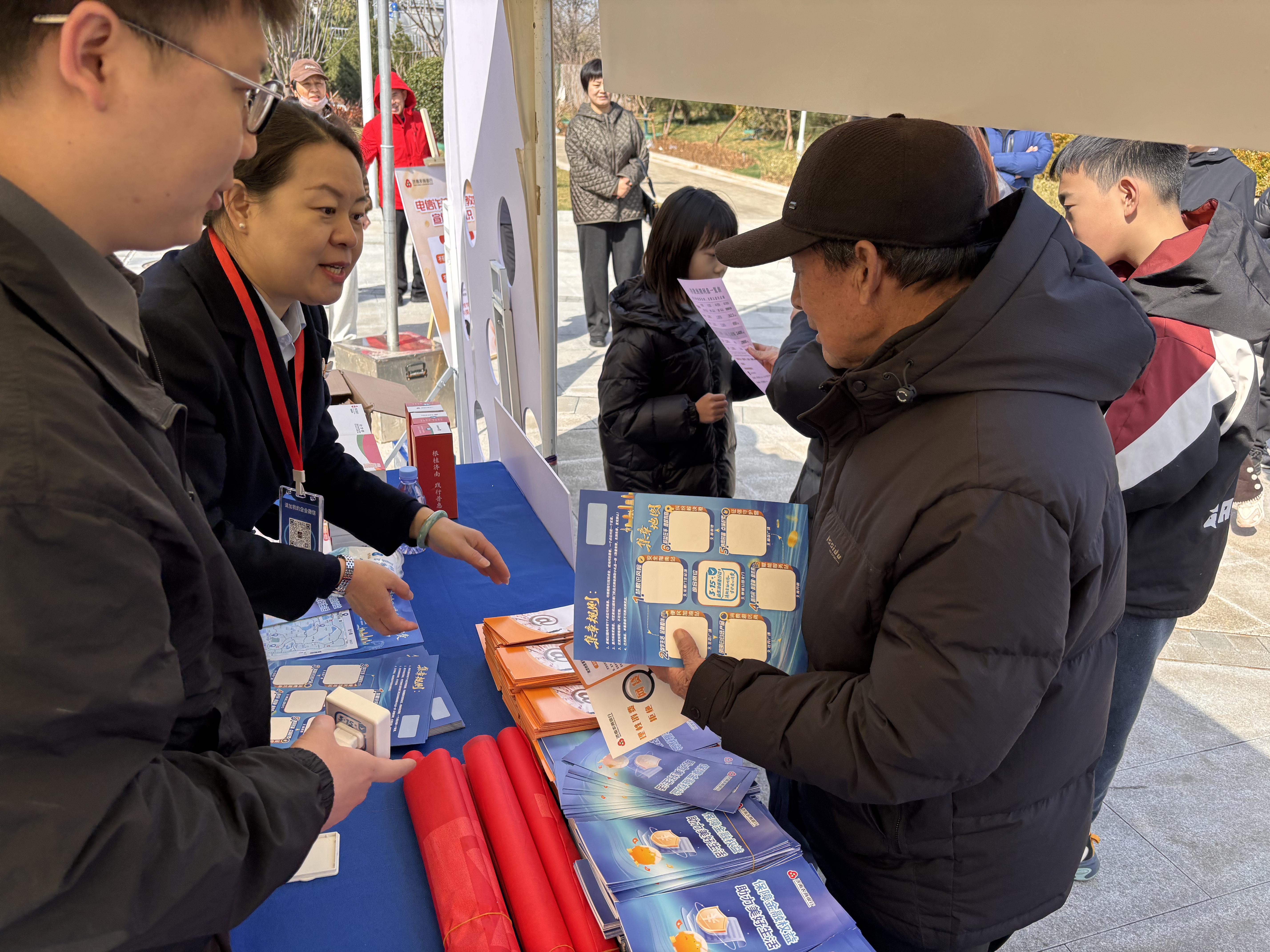宣教过程中,济南农商银行精准聚焦重点群体,扎实做好服务保障。针对老年群体“数字鸿沟”问题,安排专人开展“一对一”指导,手把手教老年人操作手机银行、查询账户,细致讲解智能设备使用技巧和反诈知识,切实守护老年人养老资金安全。同时,重点关注“两司两员”等群体,结合其户外工作、时间零散的特点,设立专属咨询台,发放宣传折页,耐心解答其关心的资金安全、支付便捷性等问题,为“两司两员”群体提供贴心金融服务。