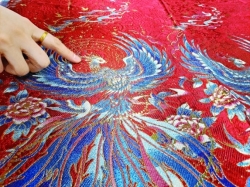 一匹柔软的金丝锦缎,被推送到生产线开端,开始第一道工序——机器压衬。布与衬在高温作用下瞬间粘合,面料挺括的质感油然而生。经过高