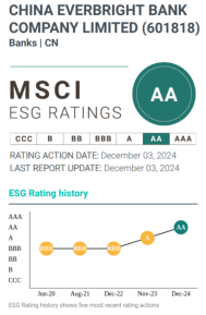 近日,明晟(MSCI)发布2024年度光大银行ESG评级结果,光大银行ESG评级结果提升至AA级,实现评级结果两年连续提升,体现了国际资本市场