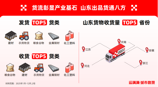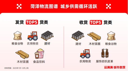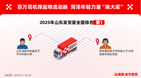 聚焦到菏泽,年轻司机挑大梁趋势明显。菏泽籍的司机师傅们,平均年龄不到30岁,散发出物流力量的蓬勃活力。粮食、农资从菏泽大量运出,这是“农业大市”的根基。建材、木材苗圃关乎城市建设与绿色产业,也在发货TOP 5行列。同时,菏泽运进建材、木材和服饰布料等,展示出充满活力的城乡经济循环。