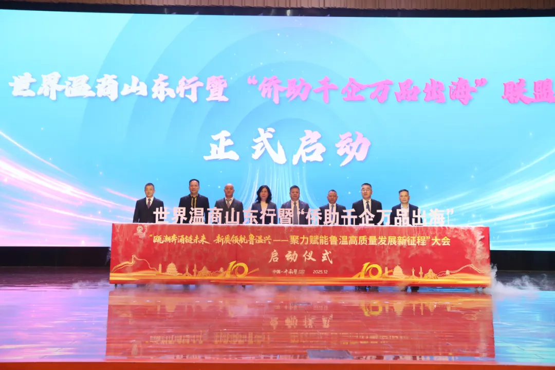 会上,还举行了世界温商山东行暨“侨助千企万品出海”联盟启动仪式。山东省商务厅党组成员、副厅长王红,山东省侨联副主席卢文朋,浙江省侨联副主席、温州华侨总商会会长夏烈,浙江省侨联副主席刘光华,温州市工商联副主席(兼)加拿大中国(友好)和平统一促进会名誉会长陈时满,澳门温州同乡联谊会会长林小冬,温州市侨联副主席(兼)西班牙华侨华人青年联合总会会长叶建伍,与山东省温州商会会长吕金朝共同登台助力联盟启动,标志着山东将与全球温商深度牵手,整合全球温籍侨商资源、服务“双循环”战略,助力本土企业对接国际市场。
